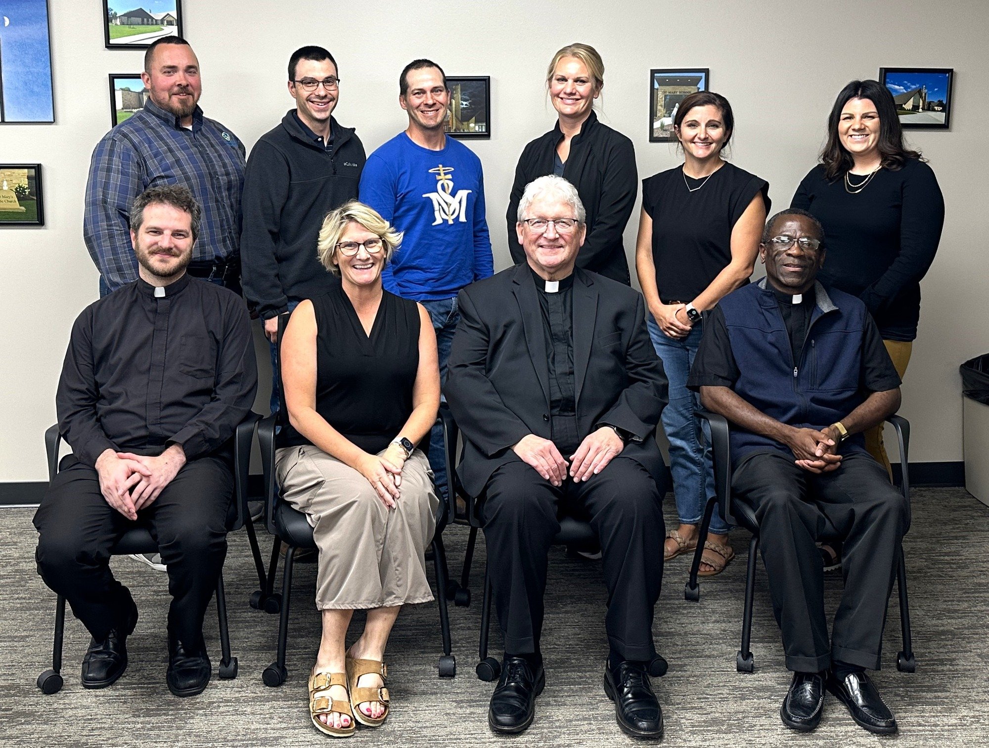 Second row-left to right: Kevin Marso, Michael Tlach, Philip Kramer, Kirstin Nostrom, Christy Vitzthum, and Arianna Broderick. First row-left to right: Fr. Ross Caniglia, Principal Sara Bormann, Msgr. Kevin McCoy, and Fr. Francis Makwinja.